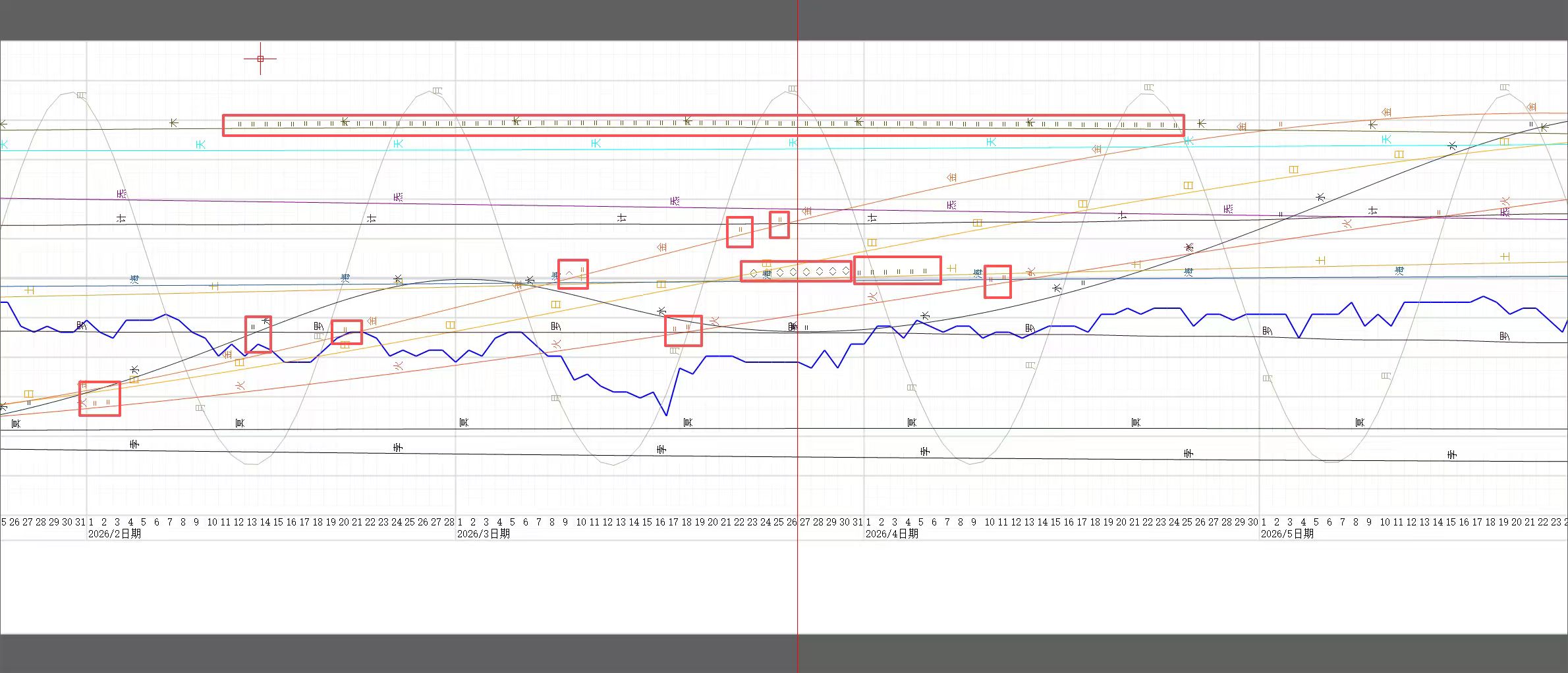 3、运势图中间添加“行限宫线”与“行限宿线”,颜色是宫宿五行属性,另下面添加有对应每年一月份行限所在的宫与宿。可以通过线条的切换交接月份而判断行限交接具体的月份。一般在换运附近前后半年会发生一些工作生活上的变化。