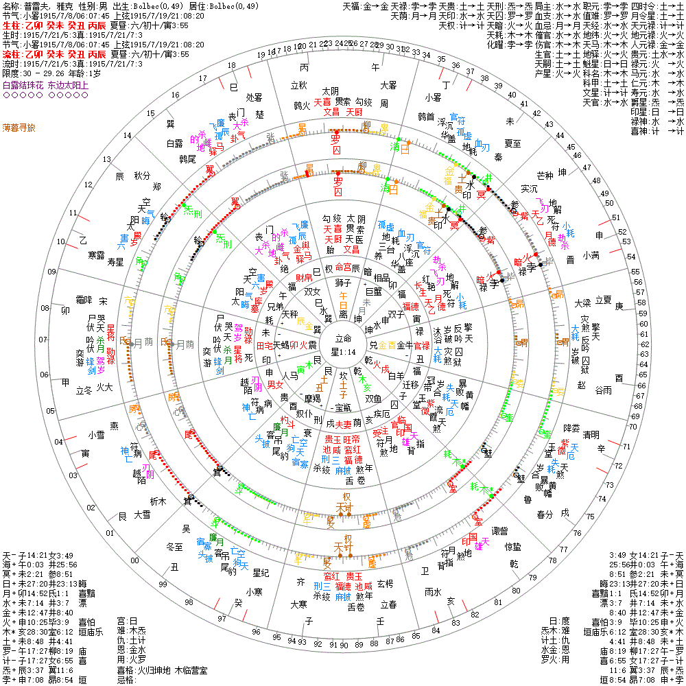 小运:乙卯1 甲寅2 癸丑3 壬子4 辛亥5 庚戌6 己酉7 戊申8 丁未9 丙午10 乙巳11 甲辰12 癸卯13 壬寅14 辛丑15