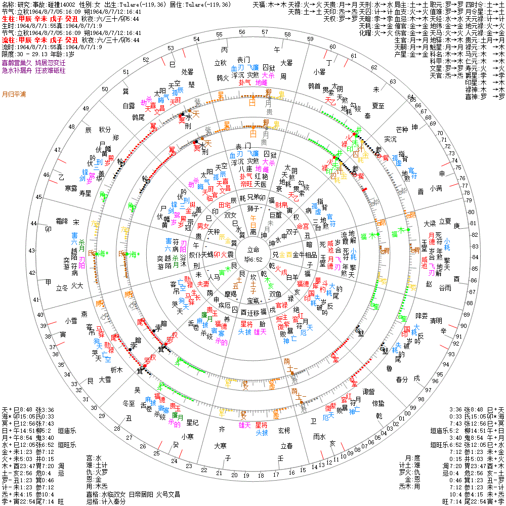 《万物摧枯》夏末秋初之火,斯时秋阳杲杲,借水以济其盛,乃刚柔变化,最不宜与木炁同照、火罗朝拱、太阳无水济润,迎照度限,万物摧枯,一陷千丈。《七政四时论》如有一水贯日,一孛济火,为之淋漓普济苍生,万物苏茂精神宛转富贵。经云:火焰而无水淘溶,纵发而早年夭折。又有先见火日,後见水孛,此谓之久旱乾焦,稿苗得雨,先主艰难而後快活。又有先见水孛,後见火日,谓之久雨逢晴,先主快活而後艰辛。《七政四时论》