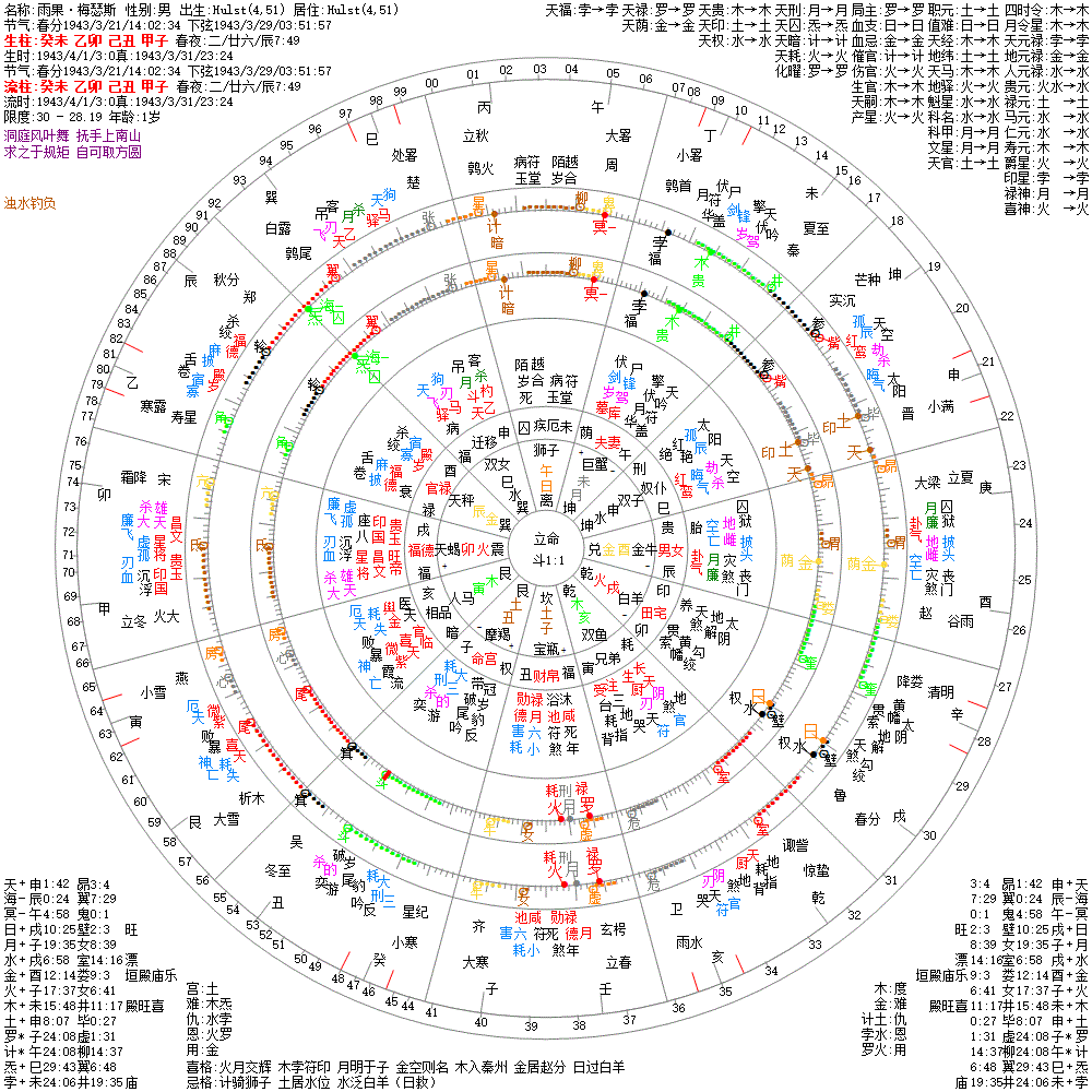 大运:甲寅10 癸丑20 壬子30 辛亥40 庚戌50 己酉60 戊申70 丁未80 丙午90 乙巳100