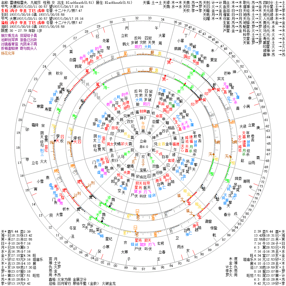 大运:庚子10 己亥20 戊戌30 丁酉40 丙申50 乙未60 甲午70 癸巳80 壬辰90 辛卯100
