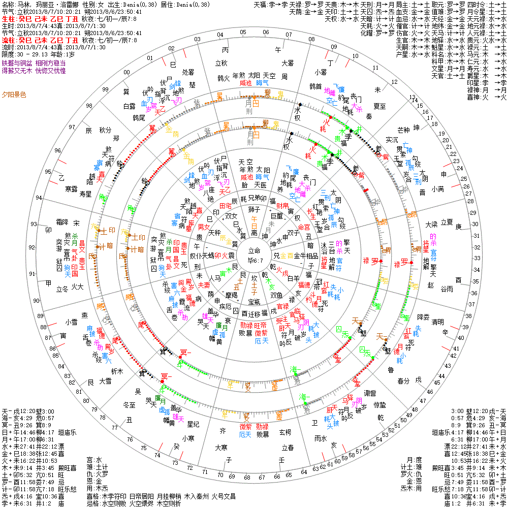 《万物摧枯》夏末秋初之火,斯时秋阳杲杲,借水以济其盛,乃刚柔变化,最不宜与木炁同照、火罗朝拱、太阳无水济润,迎照度限,万物摧枯,一陷千丈。《七政四时论》如有一水贯日,一孛济火,为之淋漓普济苍生,万物苏茂精神宛转富贵。经云:火焰而无水淘溶,纵发而早年夭折。又有先见火日,後见水孛,此谓之久旱乾焦,稿苗得雨,先主艰难而後快活。又有先见水孛,後见火日,谓之久雨逢晴,先主快活而後艰辛。《七政四时论》
