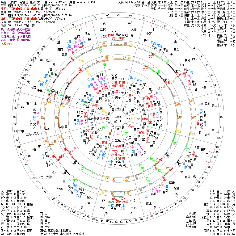 大运:辛亥6 壬子16 癸丑26 甲寅36 乙卯46 丙辰56 丁巳66 戊午76 己未86 庚申96
