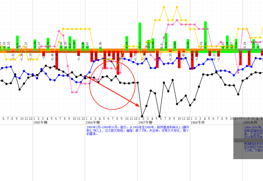 1965-1968 年运势与股市联动:在标注 “1965 午柳”“1968 午井” 的运势图中,明确显示 “土度遇到刑克” 的命理特征,而这一时期道琼斯指数恰好出现 25% 的回调,再次验证了运势线与股市波动的关联性;