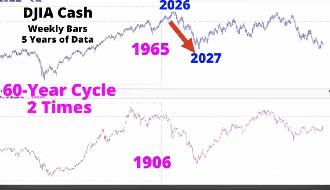 通过对比道琼斯工业平均指数(DJIA Cash)近两个 60 年周期的周线图(数据覆盖 1965-2027 年,回溯至 1906 年),我们发现股市走势存在显著的周期重合特征,具体规律如下: