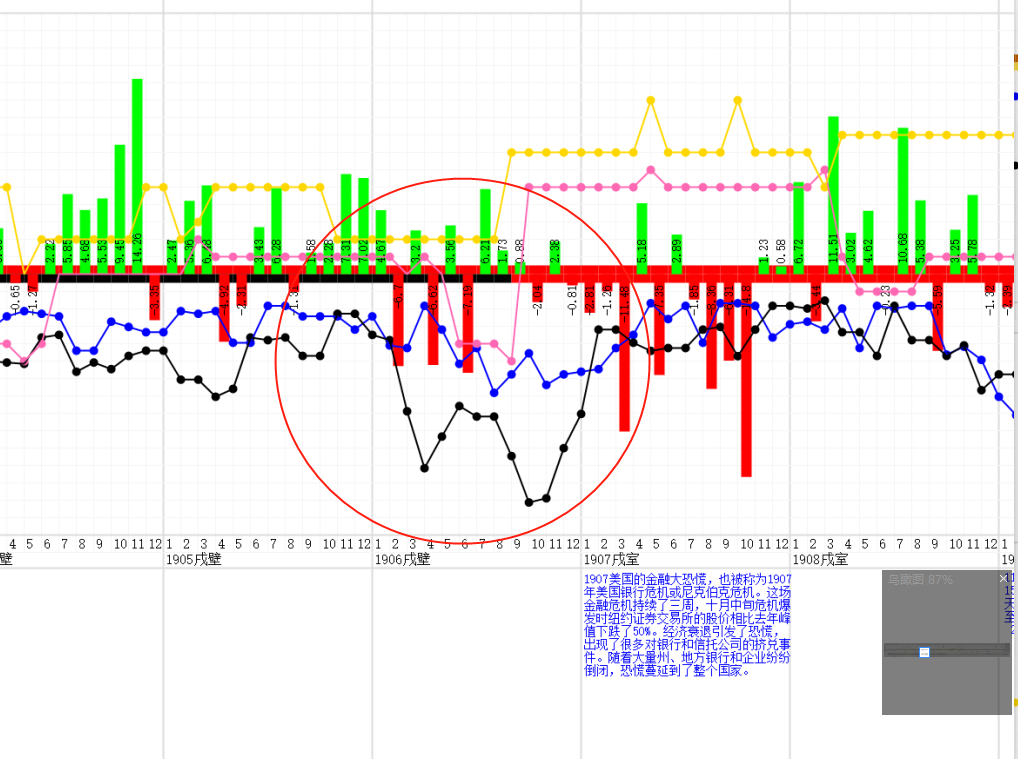 1906 年运势与股市联动:从 1906 年运势图(标注 “1905 戌壁”“1907 戌室”“1908 戌室” 时段)可见,该年第一季度运势线出现明显下跌,直至 “金色线”(代表救市信号)出现后,股市才进入反弹阶段,与同期熊市下跌、救市反弹的 K 线走势完全对应;