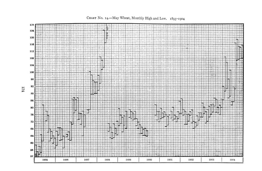 1898 年 9 月,注意到 5 月小麦期货合约再次跌到 62 美分 / 蒲式耳,在该价位维持三个月;1899 年 1 月涨到 79 美分 / 蒲式耳;之后市场波动恢复正常,价格再次涨到 1899 年 7 至 9 月的 79 美分 / 蒲式耳;1900 年 3 至 5 月跌到 64 美分 / 蒲式耳,此时月度波动幅度收窄到 3 至 4 美分 / 蒲式耳。