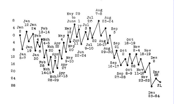 道琼斯 30 种工业股中的大多数股票将紧密遵循 1 号曲线。多数股票的高点将在 1 月 12 日左右出现,此后股价应逐步走低,趋势持续向下,直至 3 月 28 日 – 29 日左右触底,随后开启新一轮牛市。许多股票将在 3 月 14 日 – 15 日左右触底,并在狭窄区间内震荡,直至 4 月牛市启动。上涨开始后,部分股票将在 5 月达到年内高点,部分在 6 月,另有部分滞后股票将如 1 号与 2 号曲线所示,在 8 月达到最终高点。绝大多数股票的股价不会超过 7 月高点。7 月至 8 月初之后,主要趋势将转向下跌,部分股票将出现剧烈下跌,股价持续走低,首次触底时间约在 9 月 27 日 – 28 日。此后将出现一波幅度可观的反弹,震荡行情持续至 11 月初。之后,大规模熊市将正式开启,股价持续走低,在 12 月 23 日 – 24 日左右达到年内最低点。