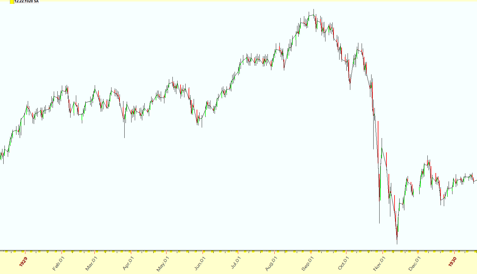 从 1921 年 8 月的低点到 1928 年 11 月的高点,20 种工业股累计上涨约 230 点,创下历史最大涨幅。1928 年该指数单年上涨近 100 点,这一涨幅同样史无前例。本年度与 1906 年、1916 年及 1919 年类似,均出现剧烈波动与巨额成交量,但次年都随之出现恐慌性下跌。