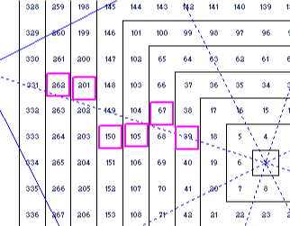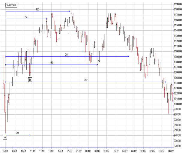 例如:从低点 A 到低点 B 间隔 39 个日历日,在九方图中找到数字 39,与其处于同一角度的数字包括 67、105、150、201、262 等。回到最初的低点,可关注从该低点起算,第 67 个日历日、第 105 个日历日等时间点,这些时间点可能出现新的价格转折点。