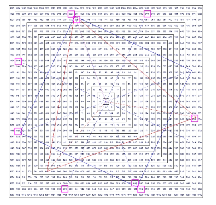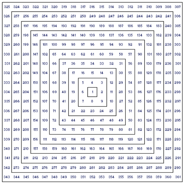从中心数字 “1” 开始,随着数字向外螺旋延伸,一个无限螺旋结构便清晰呈现。观察网格的右下角,可发现奇数(3、5、7、9、11……)的平方数,即 9、25、49、81、121,每个平方数都是该结构中一个独立的 “方形”。