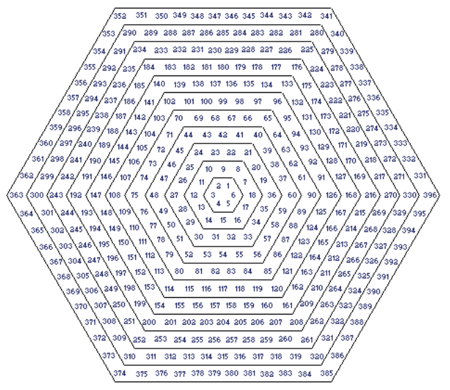 需注意,从第一圈开始,每向外延伸一圈,增加的单位数均为 6。也就是说,当完成六圈延伸后,总共增加 36 个单位。这标志着第一个六边形的完成,其对应的 127 个月,也解释了为何部分市场趋势会持续 10 年零 7 个月,直至达到六边形的方形区域或重要的 45 度末角。