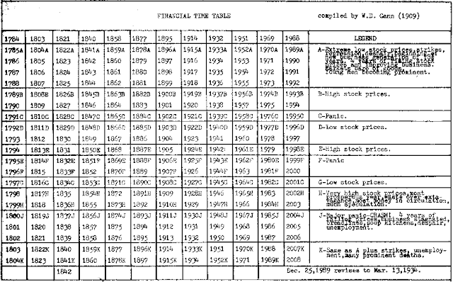 Bear markets usually start in September to November at the end of the 9th year and a sharp decline takes place. See 1869, 1879, 1889, 1899, 1909, 1919 and 1929, the year of the greatest advances, culminating in the fall of that year, followed by a sharp decline.