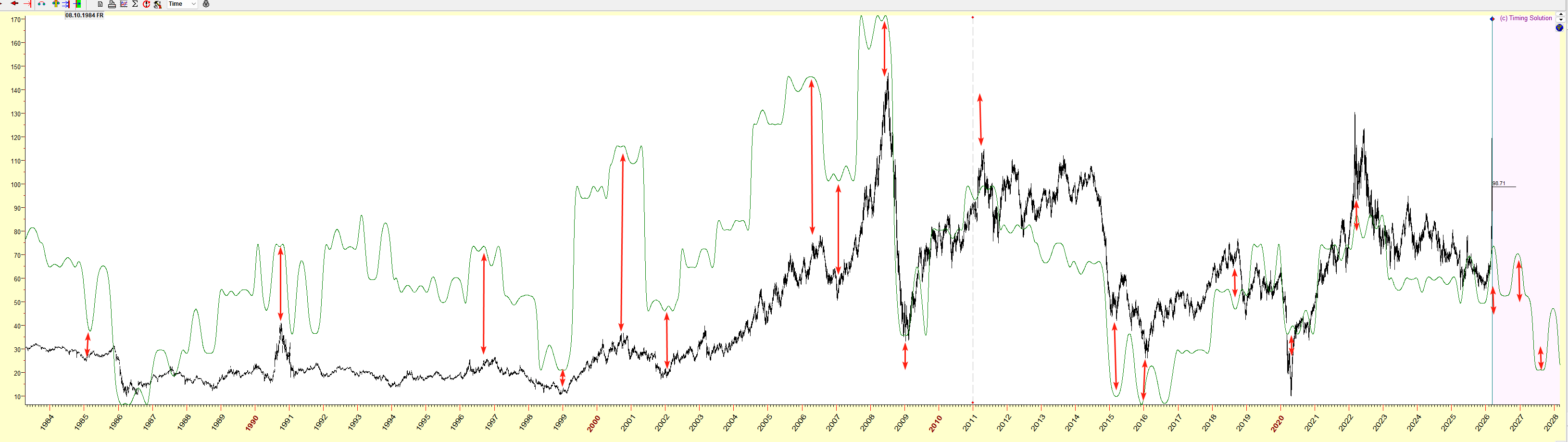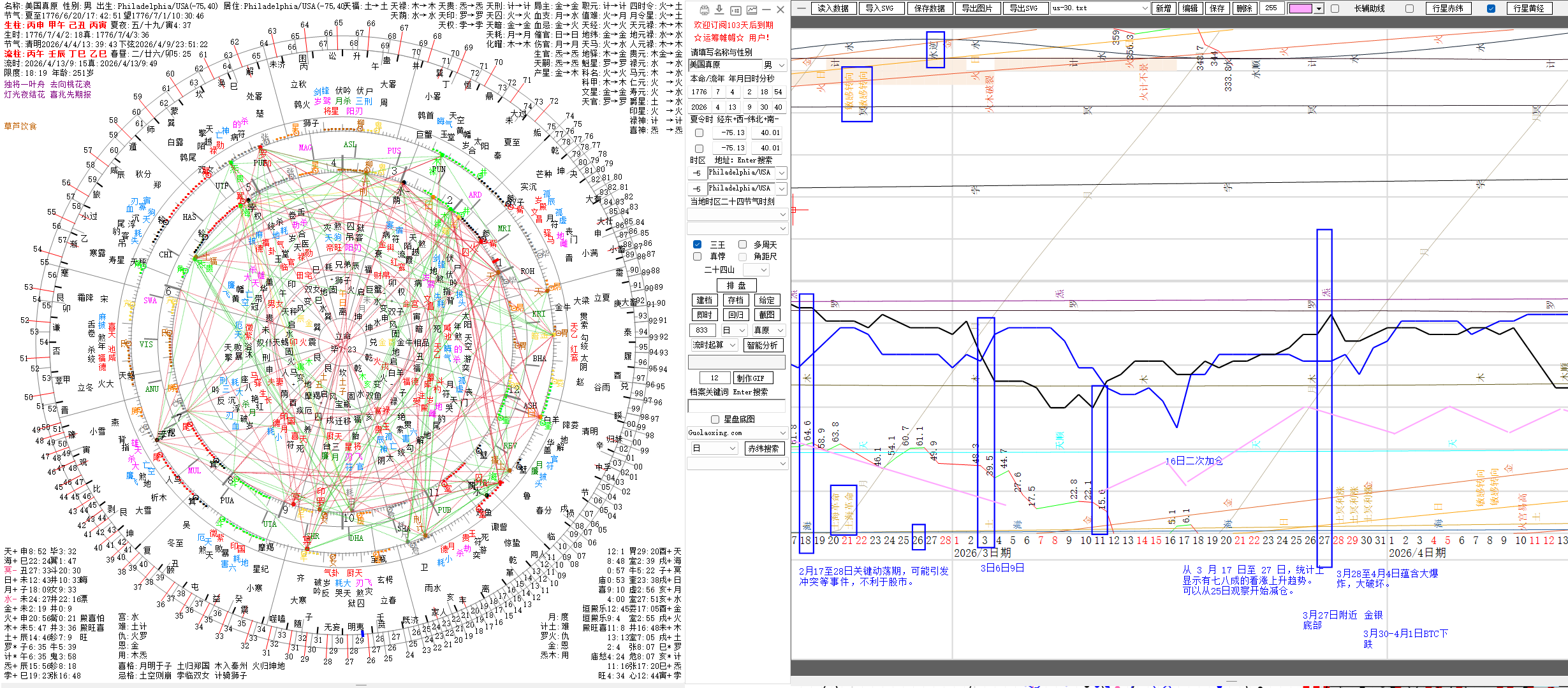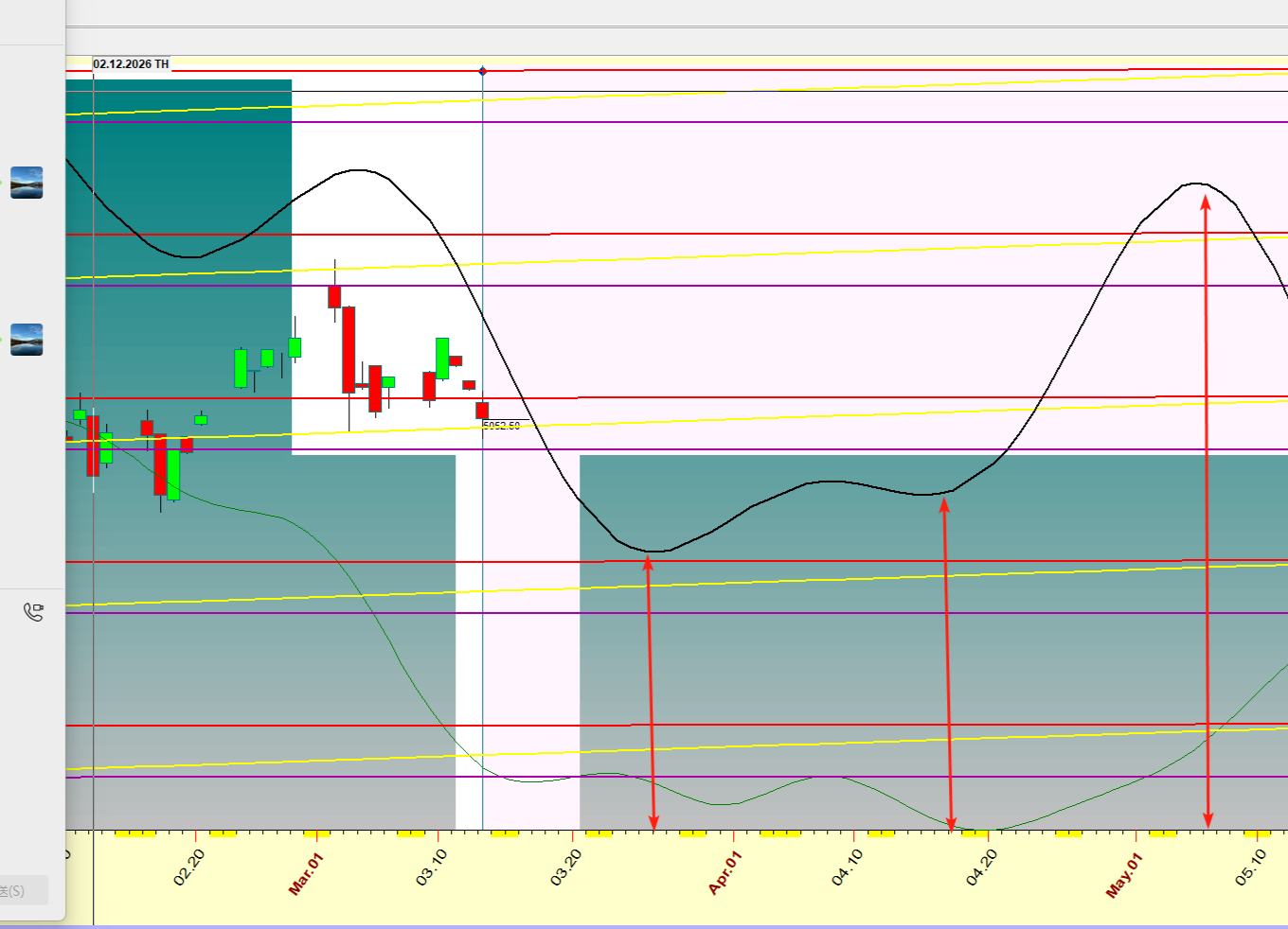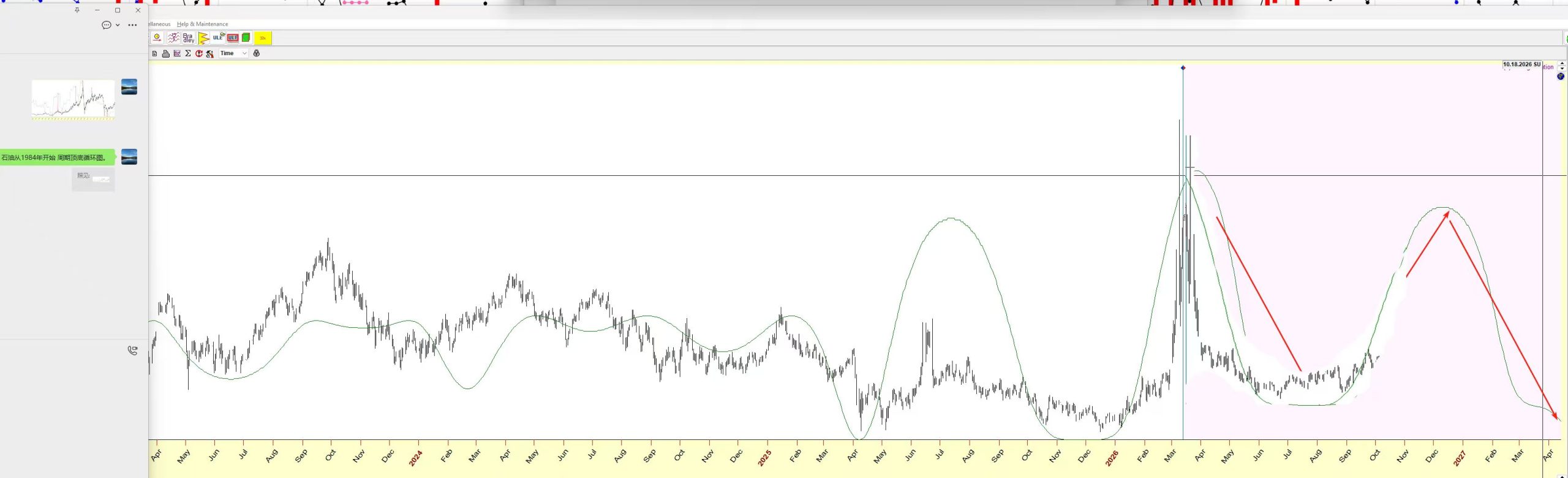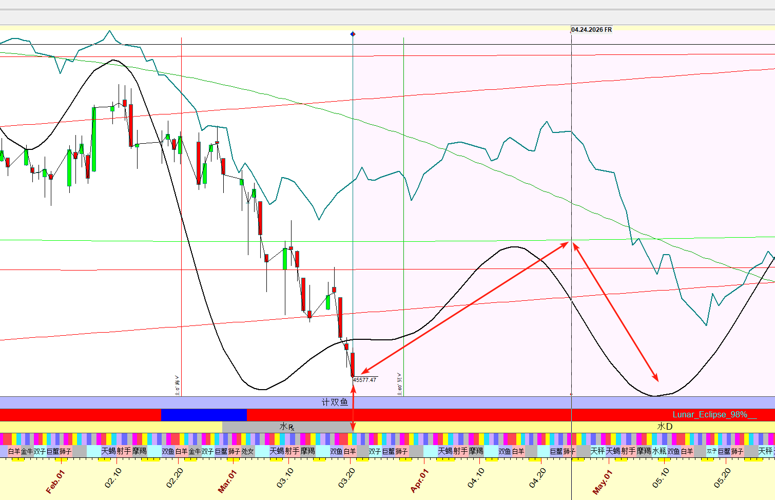 随后市场预计再次转强。根据长周期黑色线的波段推力,大概率将震荡上行至4月24日附近(对图中黑色线进行周期位移,对其墨绿线周期。),然后再次进入回调阶段。