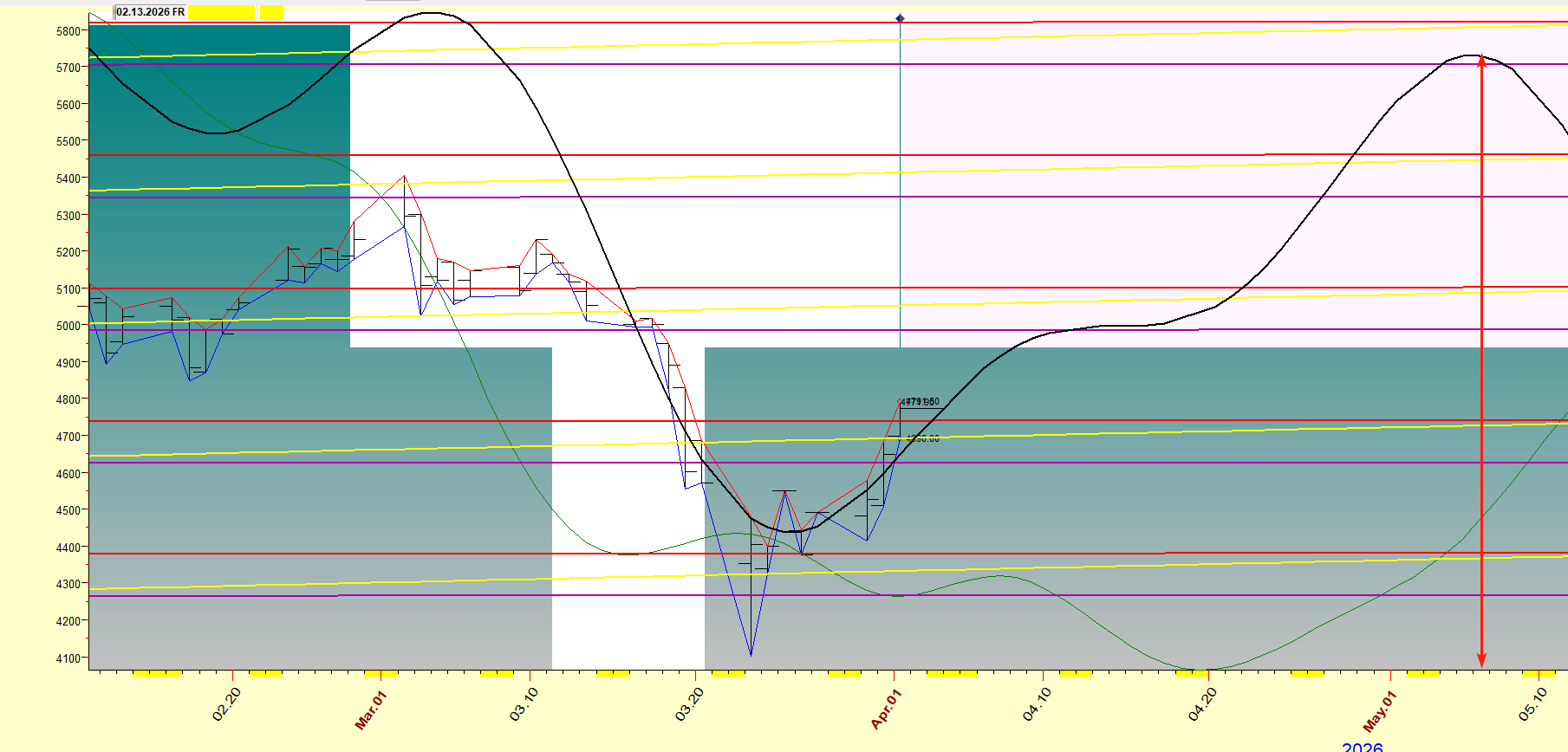 {随后市场预计再次转强。根据长周期黑色线的波段推力,大概率将震荡上行至4月24日附近(对图中黑色线进行周期位移,对其墨绿线周期),然后再次进入回调阶段。}