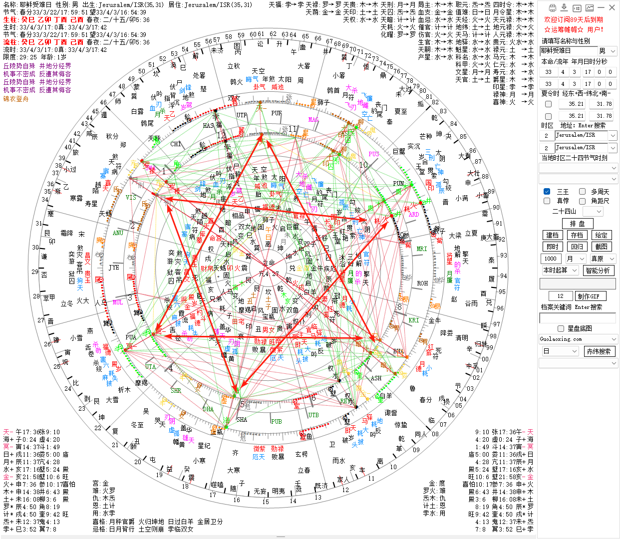 大六合相位包含了三对“对分相”(180度冲突),象征着公元33年东西方共同经历的剧烈拉扯:受难的剧痛、信用的崩塌、战争的硝烟。但它的外围被六个“六分相”包裹,这种几何上的极致对称,意味着毁灭的力量被某种更高的意志约束,并最终转化为新秩序的动能。
