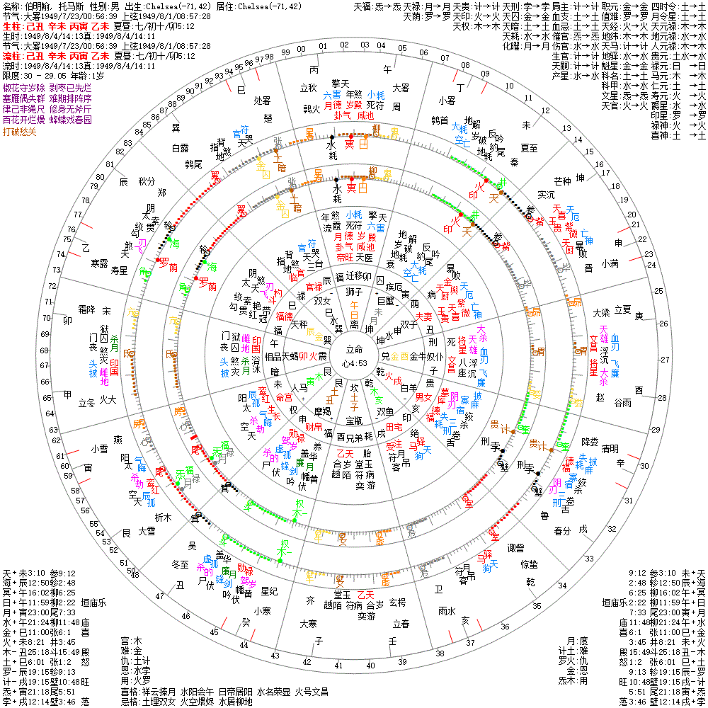 大运:庚午11 己巳21 戊辰31 丁卯41 丙寅51 乙丑61 甲子71 癸亥81 壬戌91 辛酉101