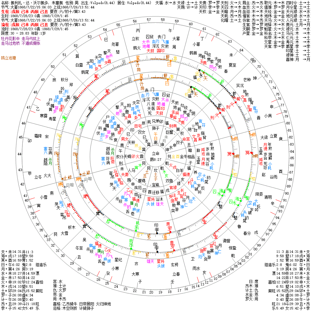 《万物摧枯》夏末秋初之火,斯时秋阳杲杲,借水以济其盛,乃刚柔变化,最不宜与木炁同照、火罗朝拱、太阳无水济润,迎照度限,万物摧枯,一陷千丈。《七政四时论》如有一水贯日,一孛济火,为之淋漓普济苍生,万物苏茂精神宛转富贵。经云:火焰而无水淘溶,纵发而早年夭折。又有先见火日,後见水孛,此谓之久旱乾焦,稿苗得雨,先主艰难而後快活。又有先见水孛,後见火日,谓之久雨逢晴,先主快活而後艰辛。《七政四时论》