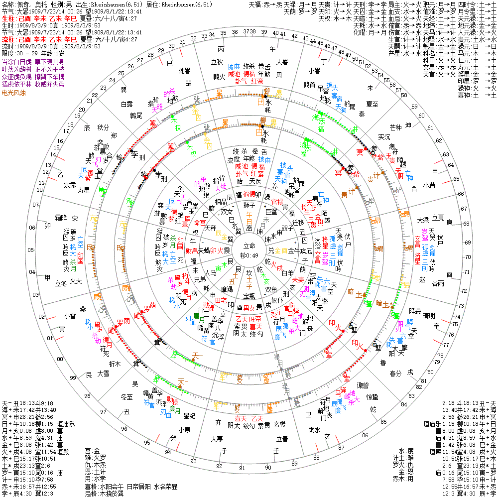 大运:庚午10 己巳20 戊辰30 丁卯40 丙寅50 乙丑60 甲子70 癸亥80 壬戌90 辛酉100
