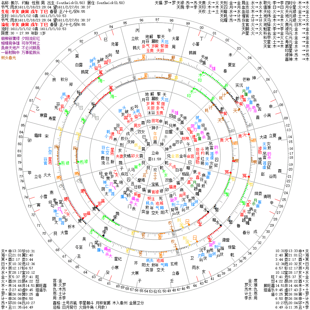 大运:己丑10 戊子20 丁亥30 丙戌40 乙酉50 甲申60 癸未70 壬午80 辛巳90 庚辰100