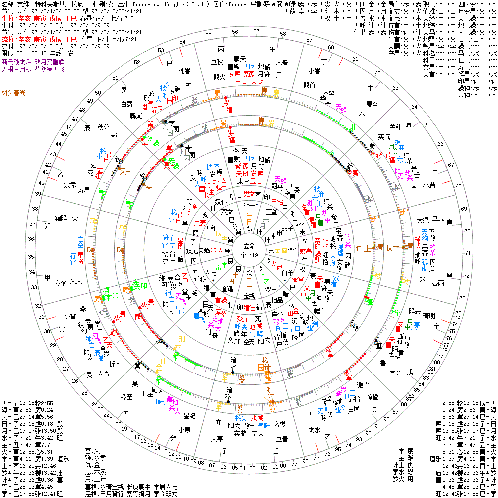 大运:辛卯9 壬辰19 癸巳29 甲午39 乙未49 丙申59 丁酉69 戊戌79 己亥89 庚子99